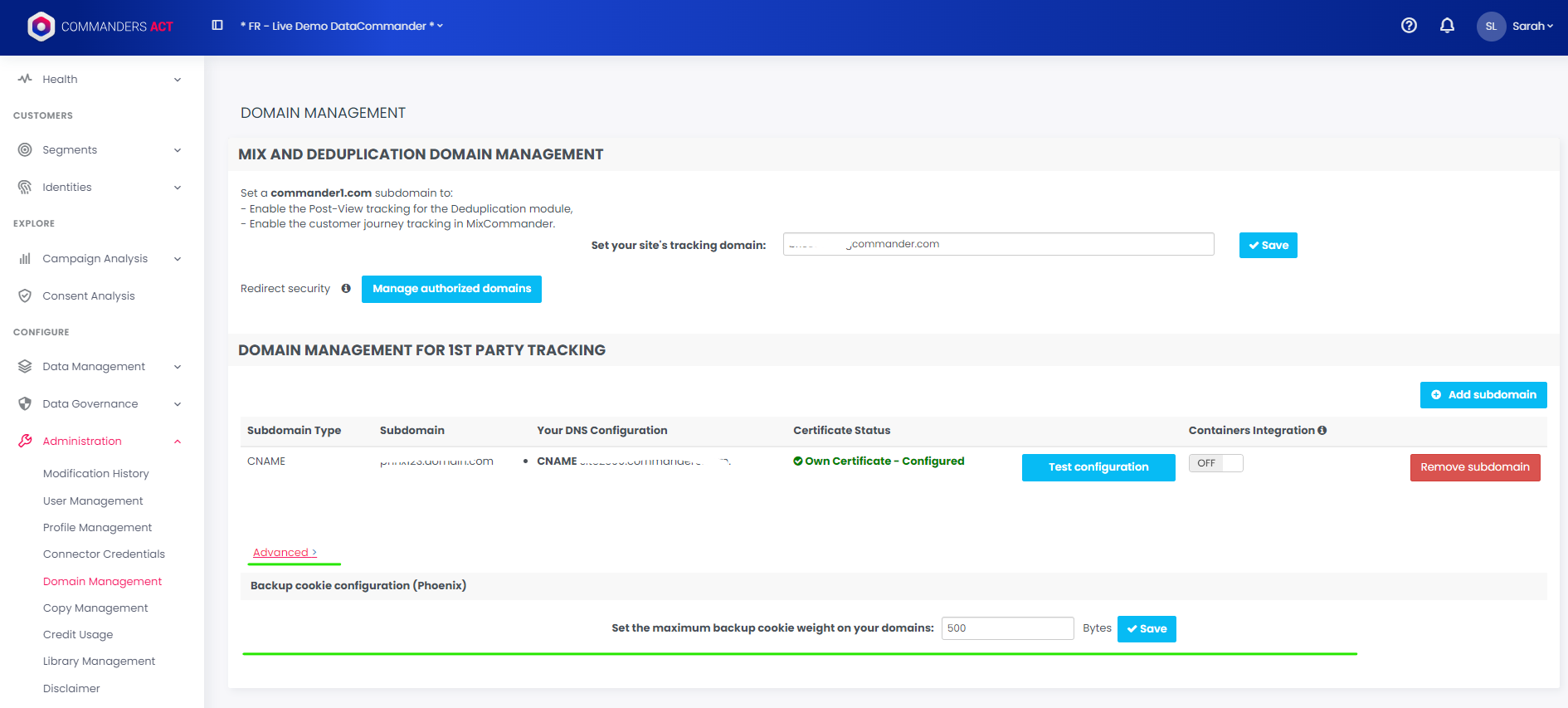 Your administrator can configure how much cookie space he wants to make available for Phoenix in your Commanders Act interface under `Admin > Domain Management`. **It is recommended to not exceed 2 kB, and we suggest a limit below 0.5 kB during initial setup**.