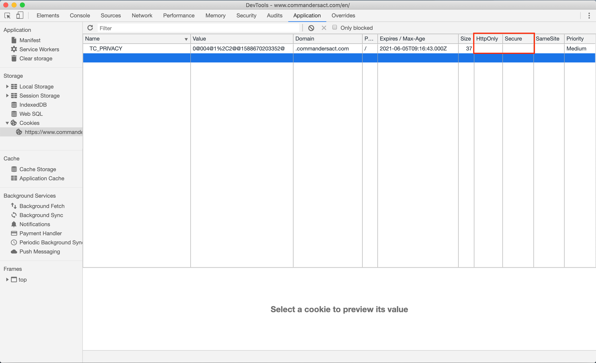 A cookie is a Secure cookie in case it has a checkmark in the Secure column.