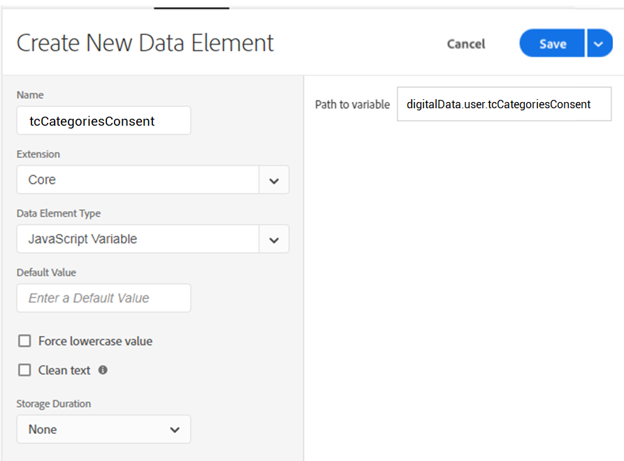 ​​If your datalayer is not set in the **digitalData** object, set the path to **tcCategoriesConsent** *(in this case the variable is created in the window scope: window\.tcCategoriesConsent)*