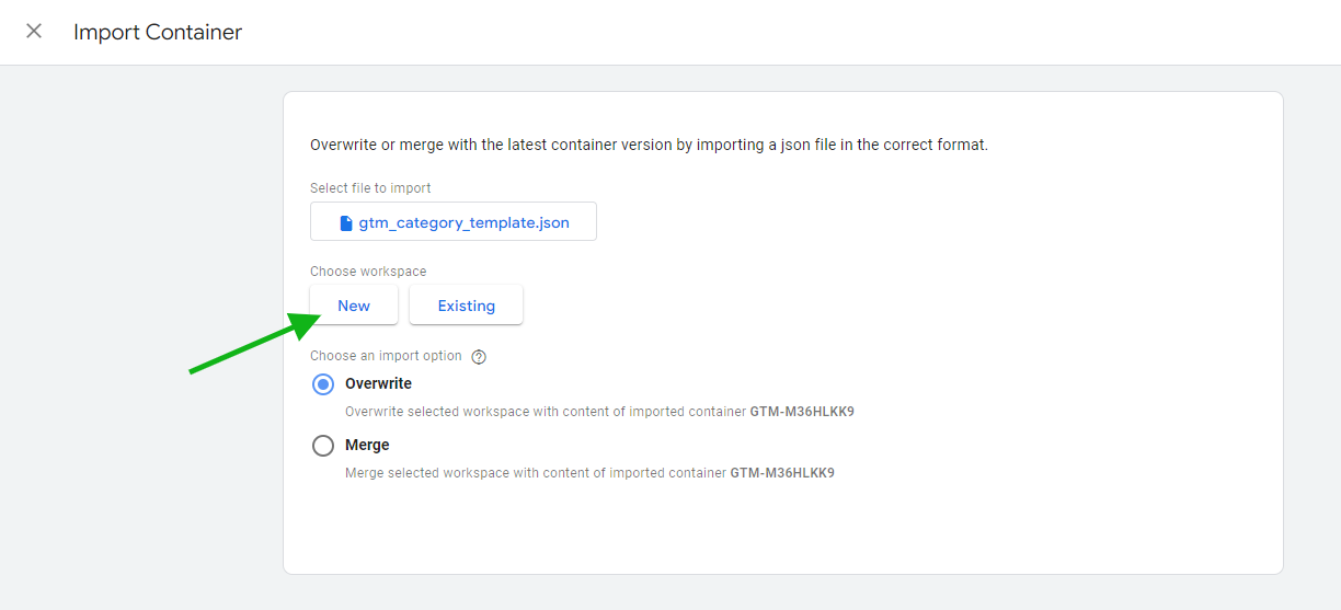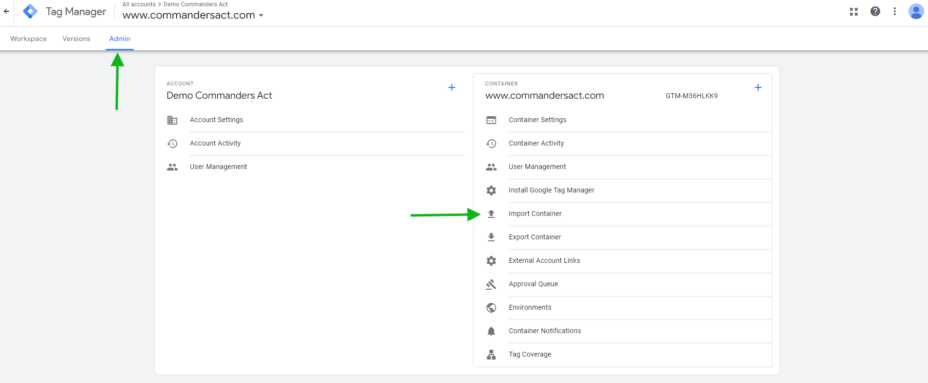 2. In this new test account, go to Admin, then on the right side of the screen click on Import Container and select the file attachment gtm\_category\_template.json