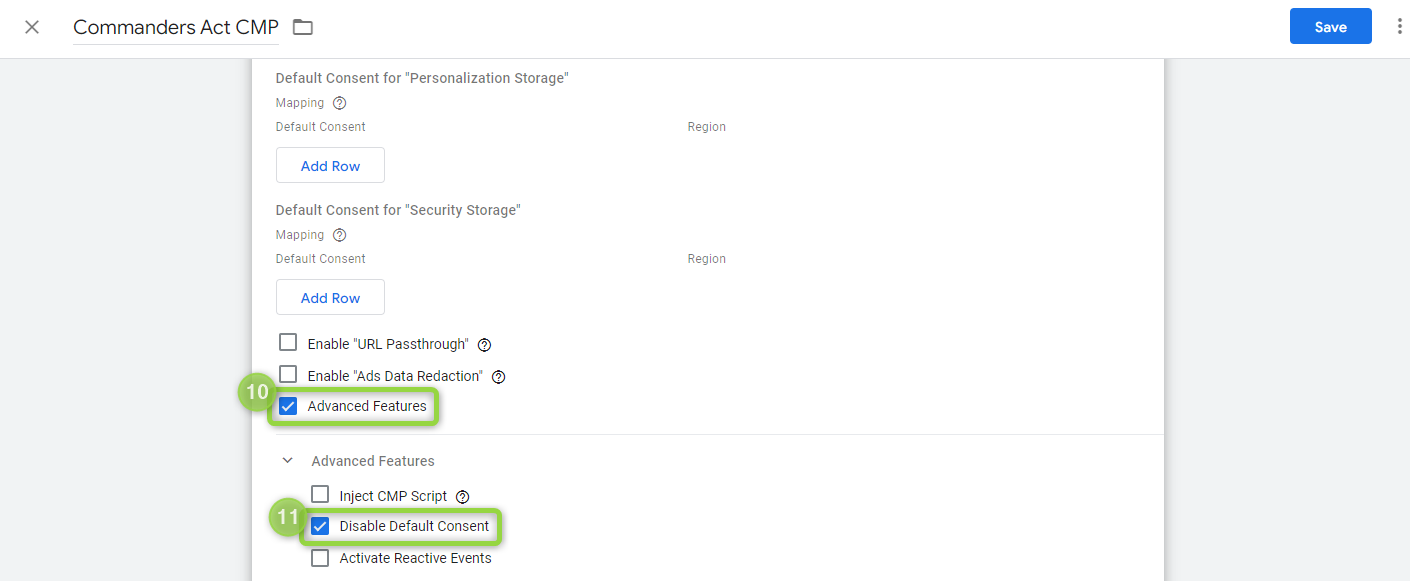 This is done by turning on the `(10)` "**Advanced Features**" and `(11)` "**Disable Default Consent**".