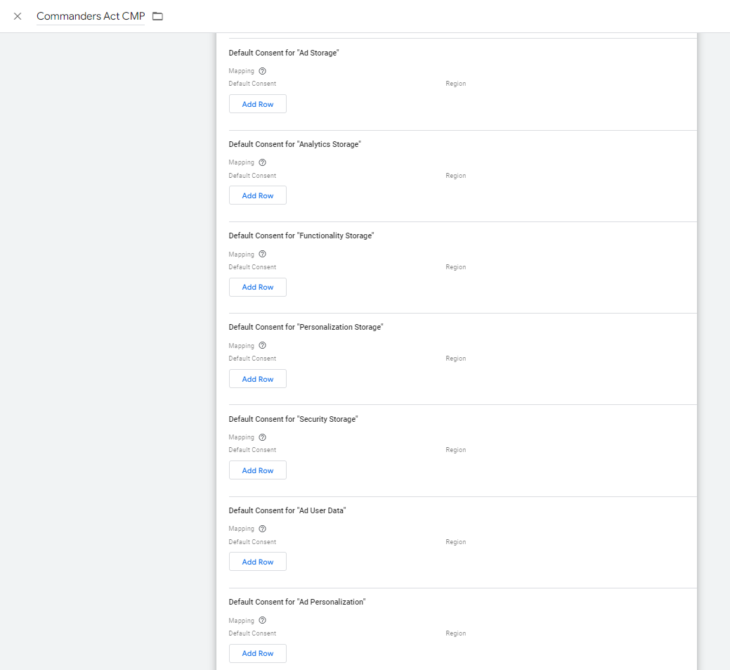 You also need to set the default status, for each of the 7 categories, before users interact with your [**privacy banner**](https://community.commandersact.com/trustcommander/user-guides/privacy-banners) and taking into account region-specific behavior. This is done by clicking the "Add Row" button and selecting either "Denied" or "Granted" to match with your input regions and/or sub-regions.