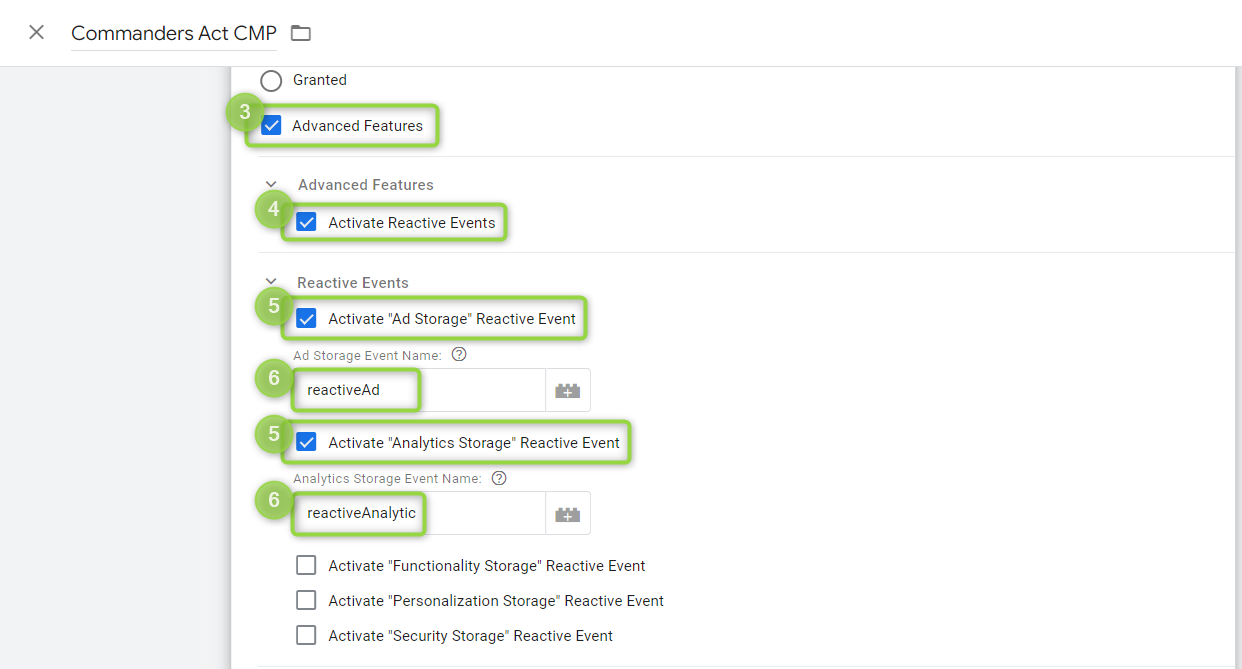 To make sure that the consent is correctly managed by GTM with third-party vendor tags, we strongly recommend to enable reactive events. Turn on the `(3)` "**Advanced Features**", `(4)` "**Activate Reactive Events**" and `(5)` "**Activate \[Storage-Name] Reactive Event**" for each \[Storage Name] you're using. Finally, enter their `(6)` "**Event Name**". These events will be used in the next section when configuring your third-party vendor tags.