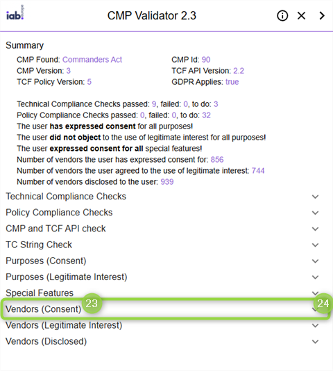 It's recommended to inspect the `(23)` "**Vendors (Consent)**" by `(24)` expanding the section: