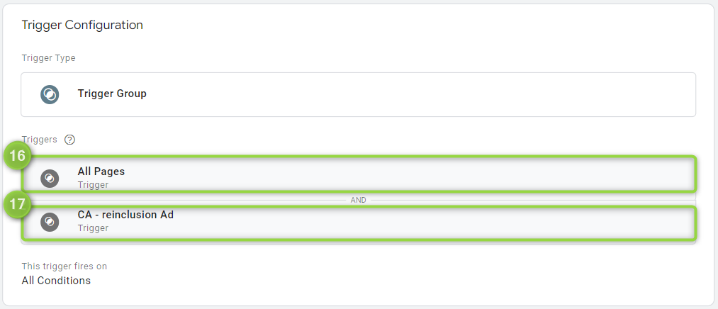 In the trigger group add `(16)` any preexisting triggers and `(17)`a trigger named as your configured reactive event.