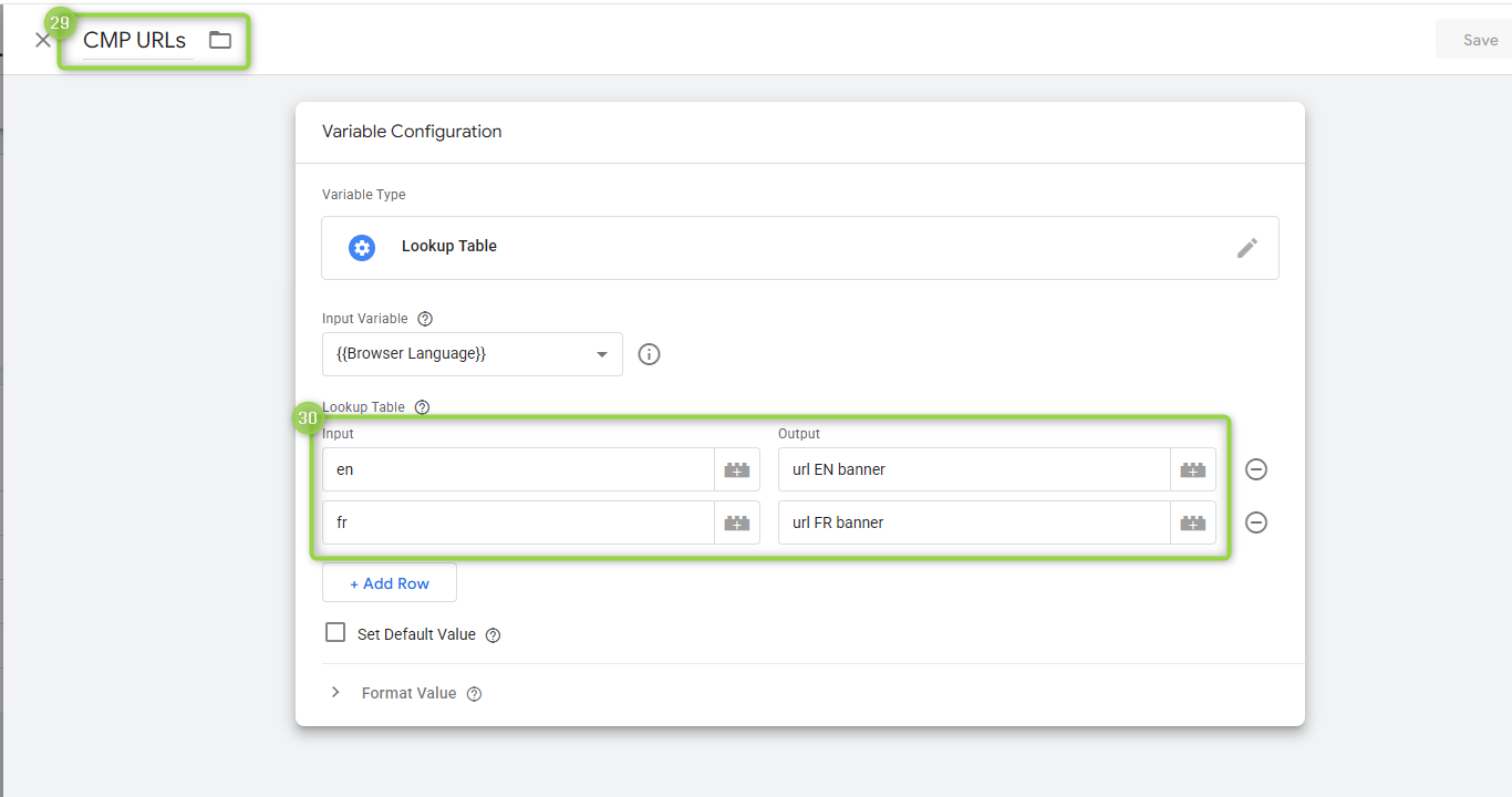 FIrst, give a `(29)` **name** to your variable and, in the `(30)` "**Lookup Table**" section, configure our wanted logic. In the "Output" column, ensure that "url EN banner" and "url FR banner" are replaced with the actual full URLs: