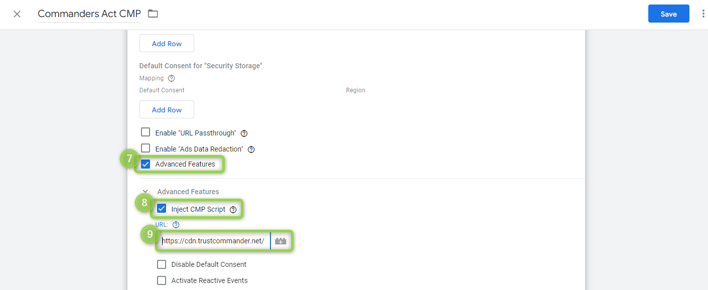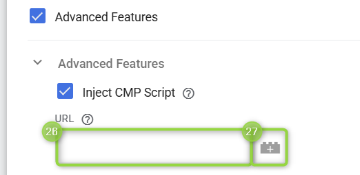 You also have the option to directly inject your CMP script by turning on the `(7)` "**Advanced Features**", `(8)` "**Inject CMP Script**" and input your `(9)` "**URL**".