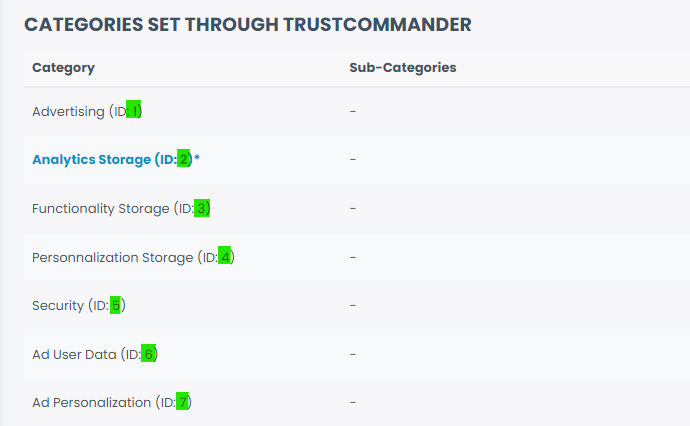 If you have sub-categories with the same scope of the five defined by Google, you need to use their ids instead of the main category ones. You can also rename your categories or change their ids by checking the subsection "[**Managing categories**](https://community.commandersact.com/trustcommander/user-guides/categories-and-tags/manage-categories#managing-categories)".