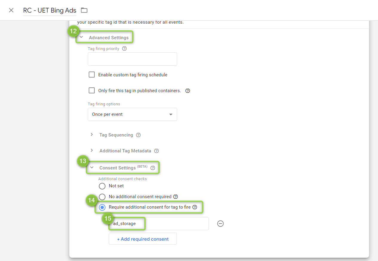 Third-party vendor tags require additional settings to properly operate with the user consent. First, open your tag configuration and check under the `(12)` "**Advanced Settings**" and `(13)`"**Consent Settings**" if a consent type (E.g. "*ad\_storage*") is already preconfigured, if not you need to add it by selecting the option `(14)` "**Require additional consent for tag to fire**" and `(15)` input the consent type(s) you want to include.