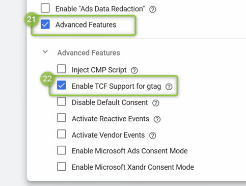 You can enable TCF support with your Google Ads tags under `(21)` "**Advanced Features**" by flagging `(22)` "**Enable TCF Support for gtag**".