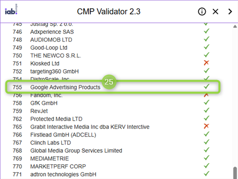 Look for the vendor name, and ensure it's reported with the proper consent status. In the following example, `(25)` "**Google Advertising Products**" is correctly green flagged as the user granted their consent: