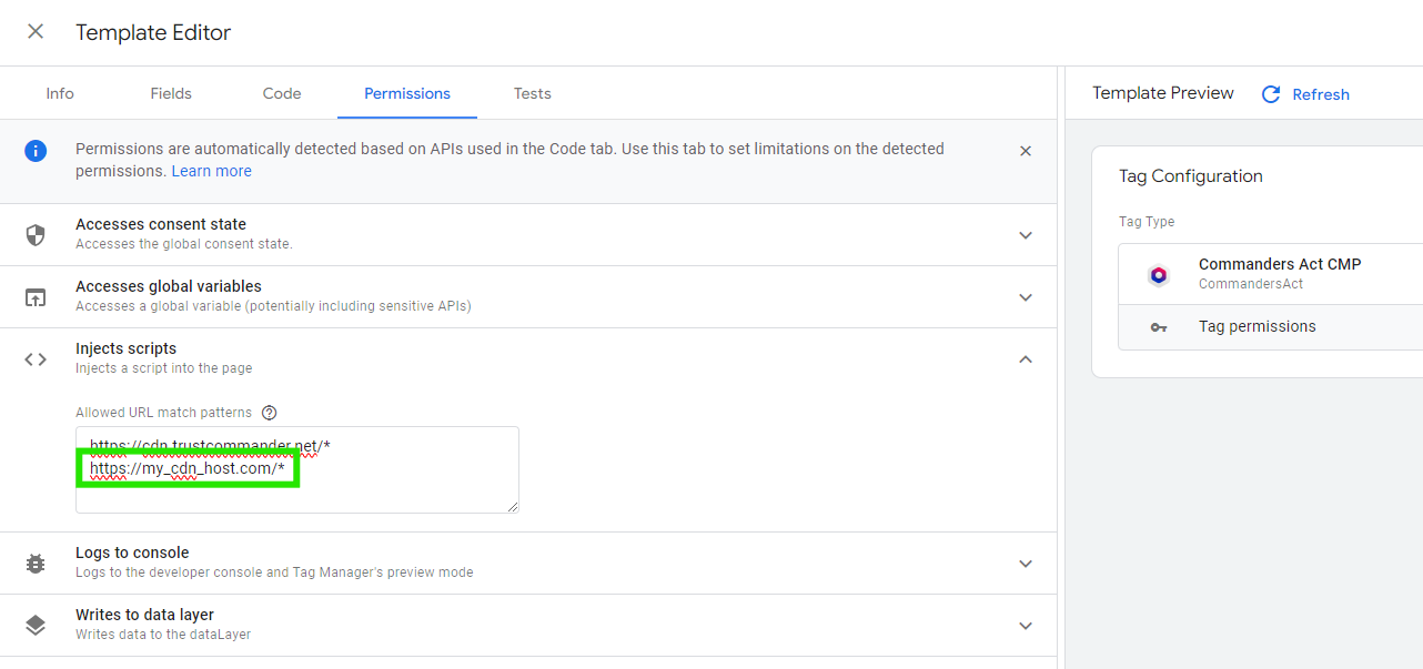 If your banner is hosted on your servers (on premise) or if you use our [CDN 1st party feature](https://doc.commandersact.com/configure/administration/domain-management), then you need to update the Permissions of the template.