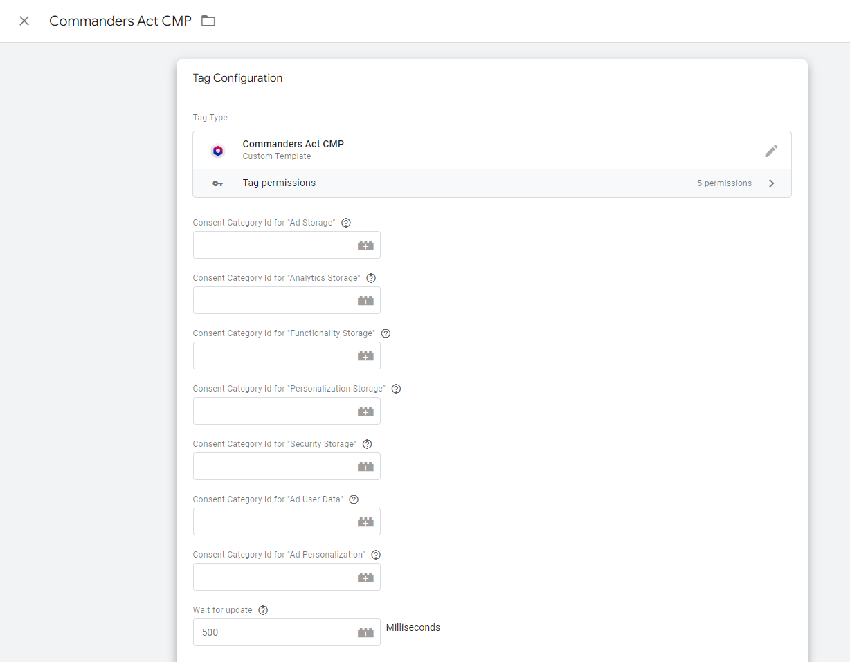 Following the above steps, adding our template "[**Commanders Act CMP**](https://tagmanager.google.com/gallery/#/owners/TagCommander/templates/GTM-OnSite-API)" from the Google "Community Template Gallery", you're presented with the following "**Tag Configuration**" which is the core area where you can manage your consent needs with GTM: