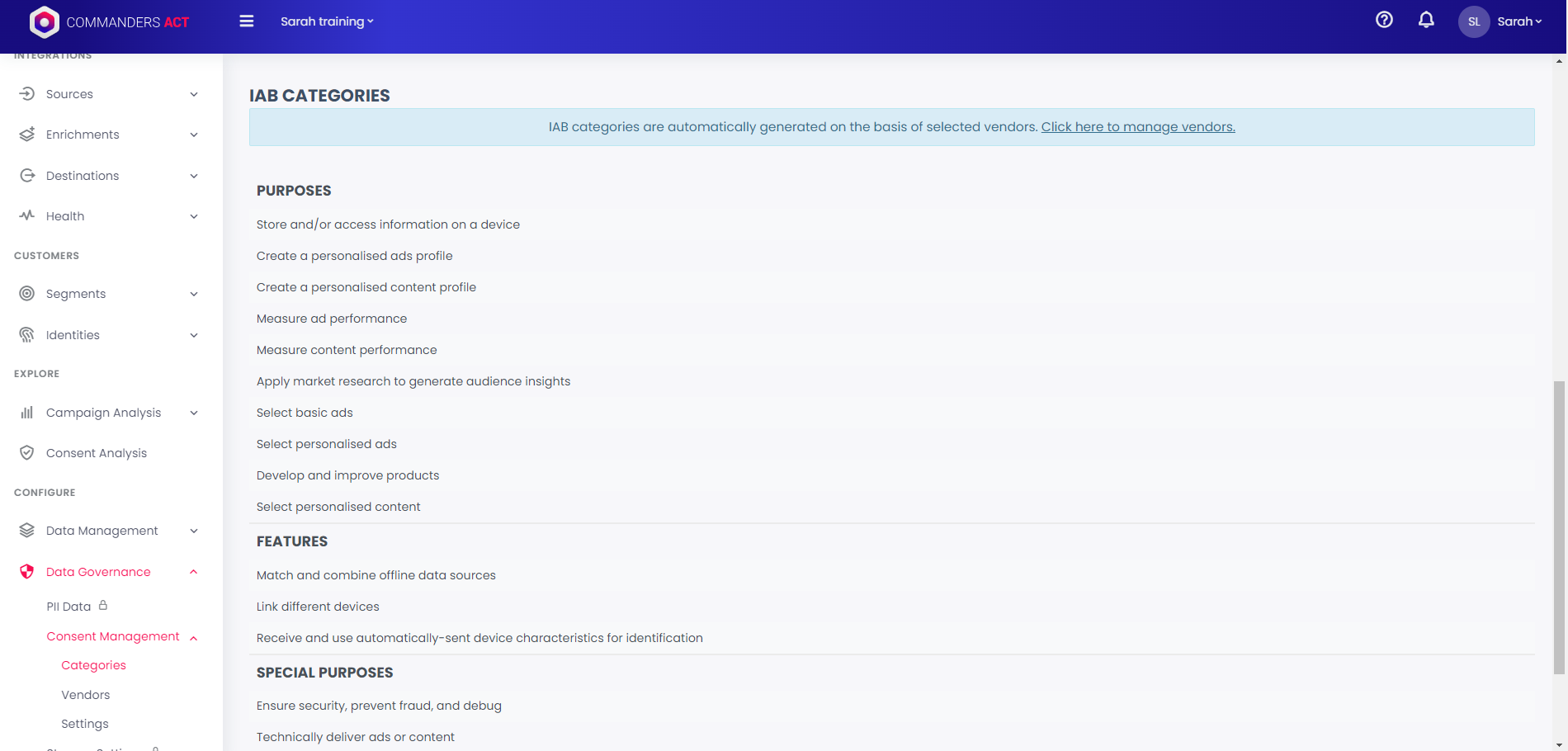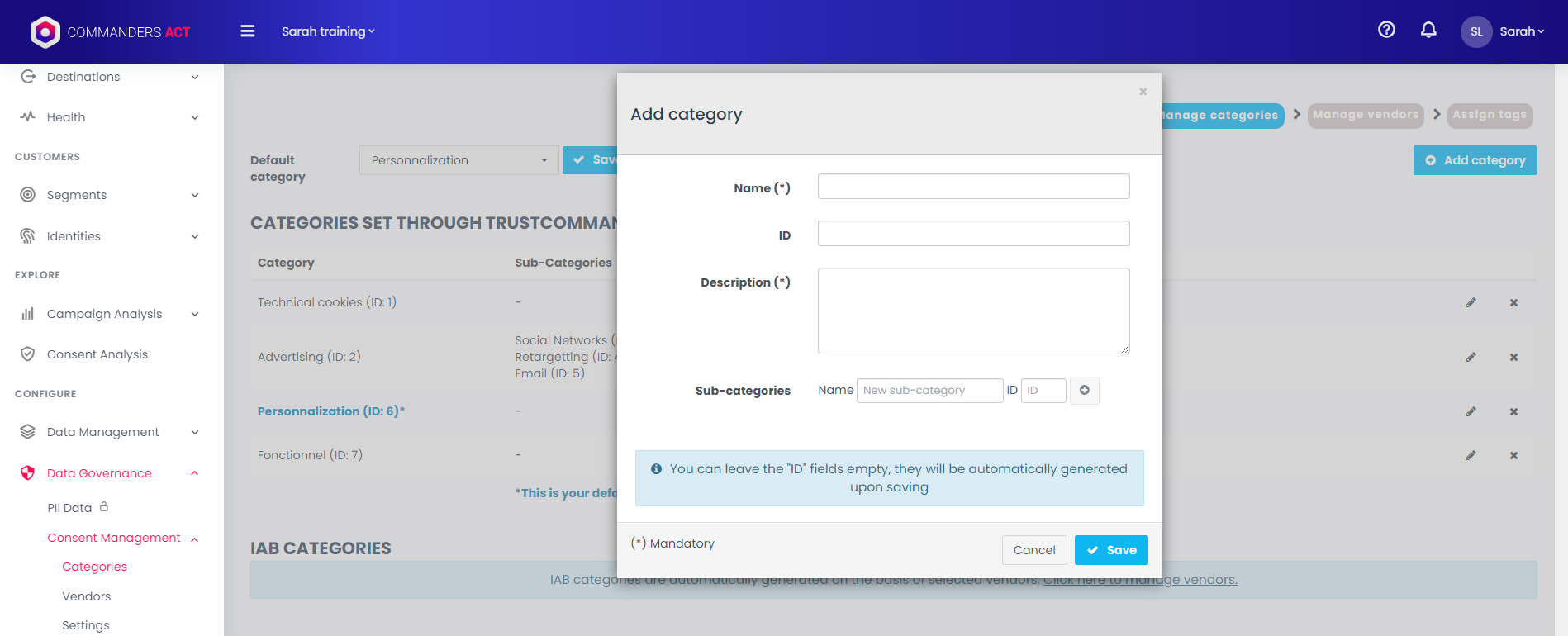 `Data Governance > Consent Management > Categories`