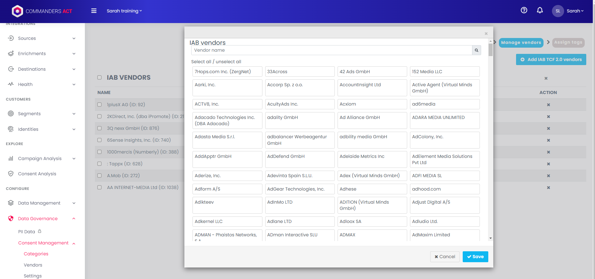 Commanders Act Consent module is compliant with IAB TCF 2.2 ([Link to official listing](https://iabeurope.eu/cmp-list/)). To enable IAB categories go to `Data Governance > Consent Management > Settings` and activate the IAB option.\