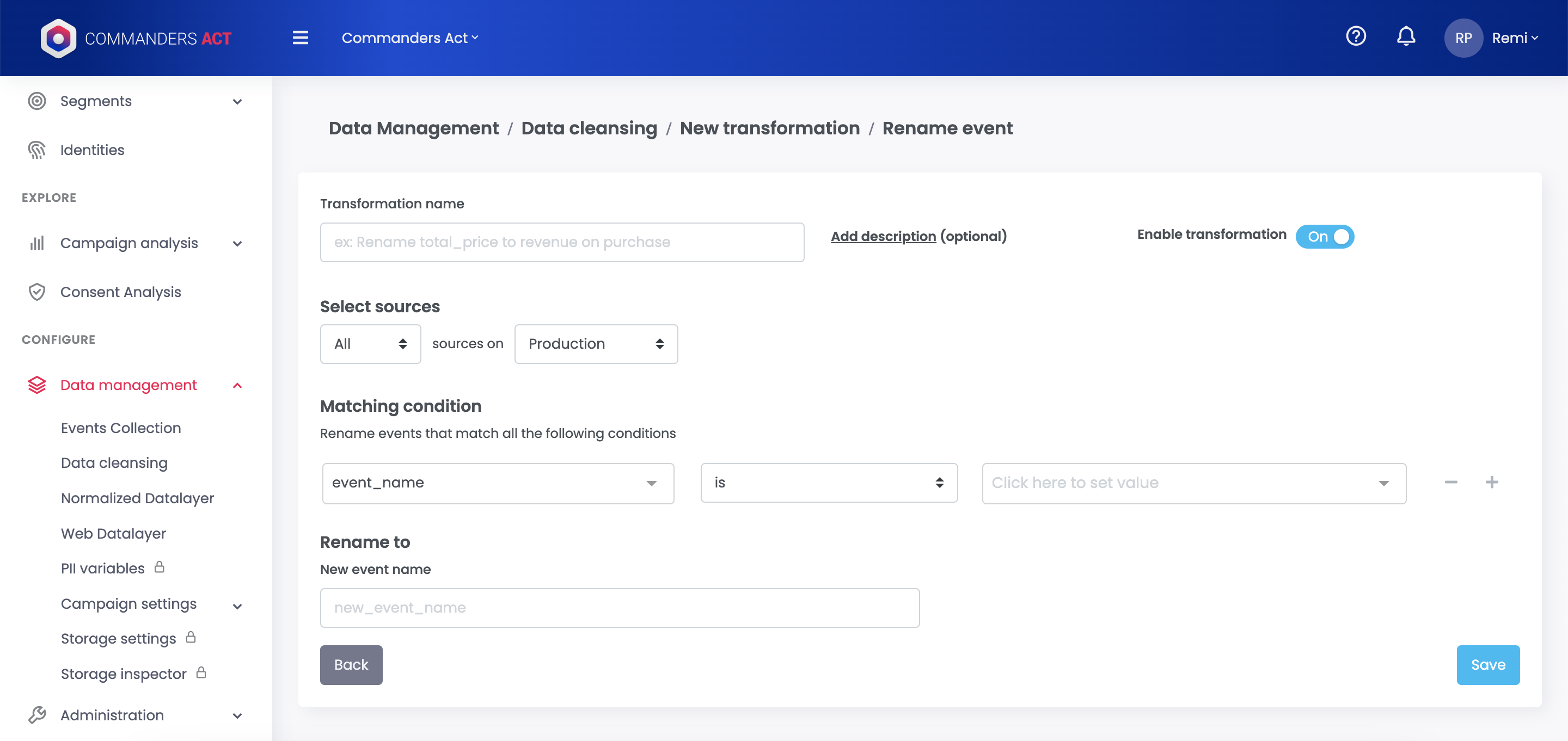 Select which event should be renamed. It is also possible to add more conditions, like rename the page view event to product view, if 'page\_type' contains 'product'.