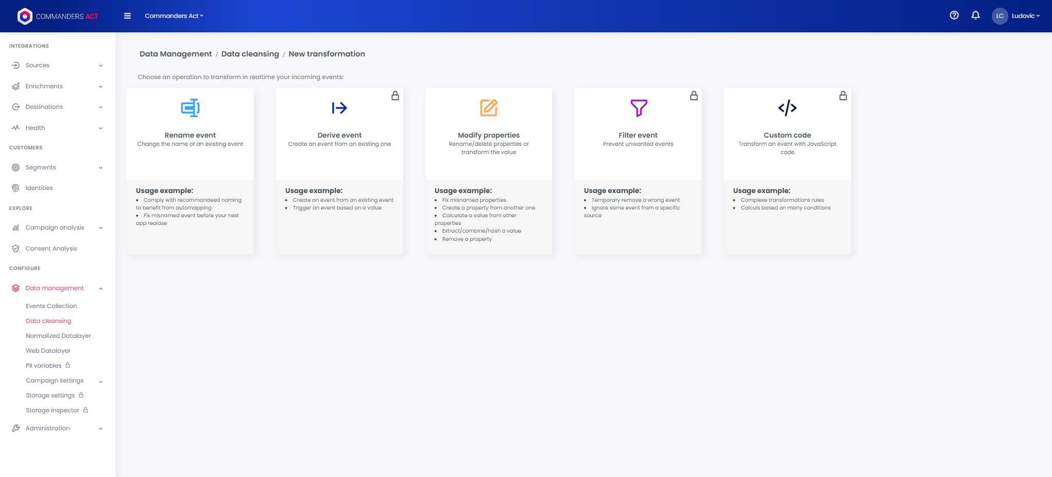 The no-code approach allows you to create transformations using simple formula based on basic [functions ](https://doc.commandersact.com/features/data-quality/data-cleansing/supported-transformation-functions)and operators.