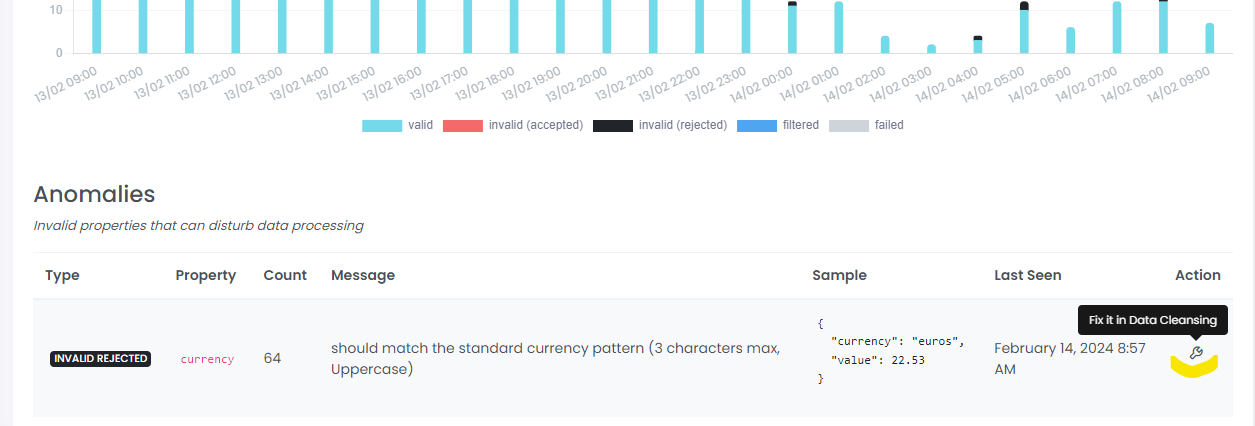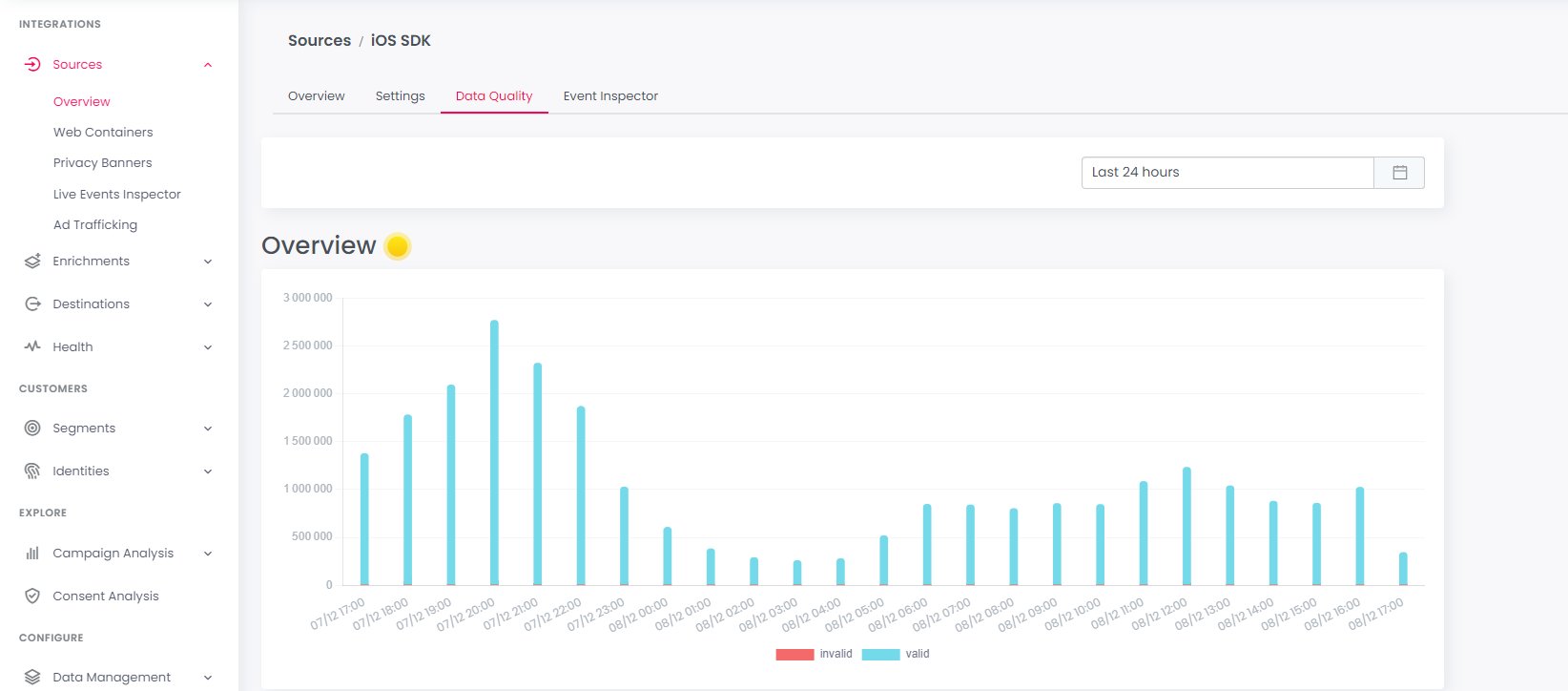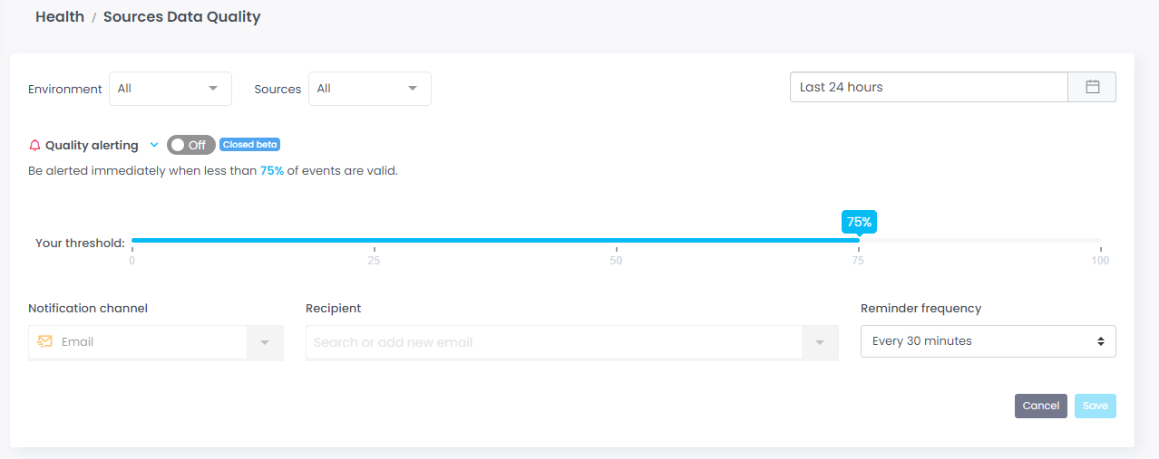 You can visualize the evolution of your event data quality over time, filter by sources or environment (default to Production)