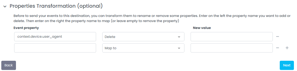 <figure><img src="https://1259070148-files.gitbook.io/~/files/v0/b/gitbook-x-prod.appspot.com/o/spaces%2F-Mk6XpTQ2LaRLcr2tA-d%2Fuploads%2Fgit-blob-095368794b4e39f77ff7343f49e70266f9a33a4b%2Fimage.png?alt=media" alt=""><figcaption><p>Properties transformation section on each destination settings step</p></figcaption></figure>