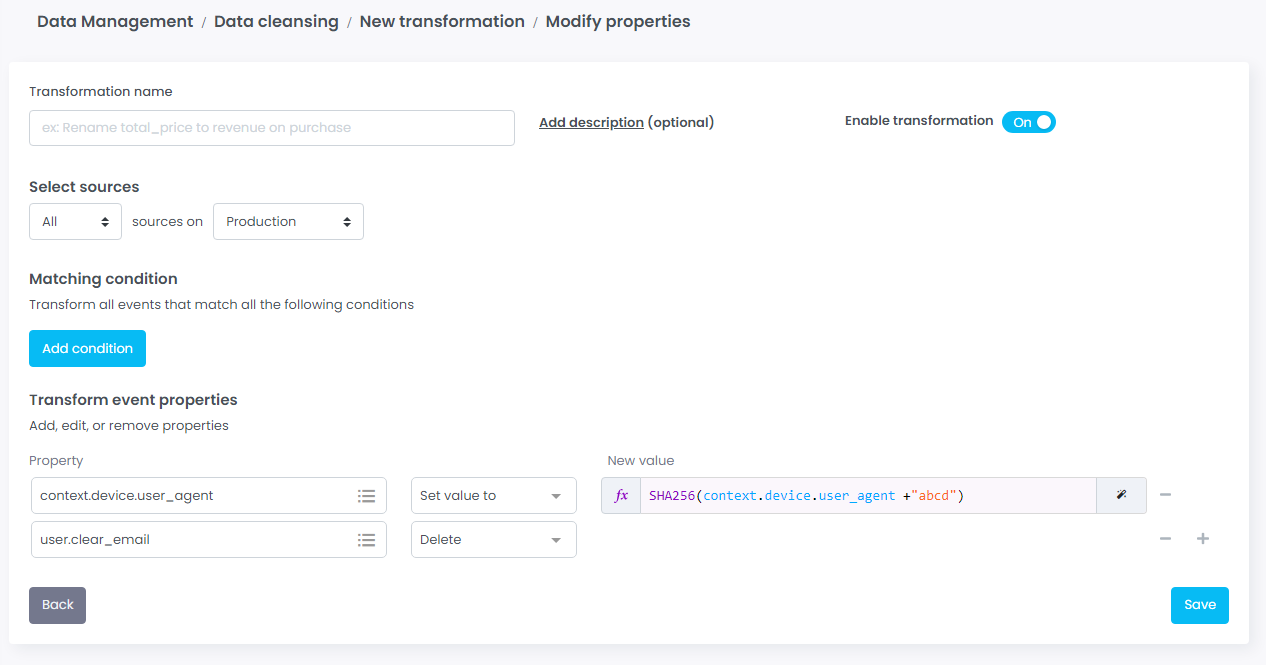 \- If needed hash your custom PII data through the smart mapping, properties transformation or [Data Cleansing](https://doc.commandersact.com/features/data-quality/data-cleansing)