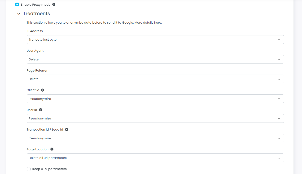When enabled, the *proxy mode* gives you access to a number of options that allow you to choose granularly how each parameter should be anonymized.