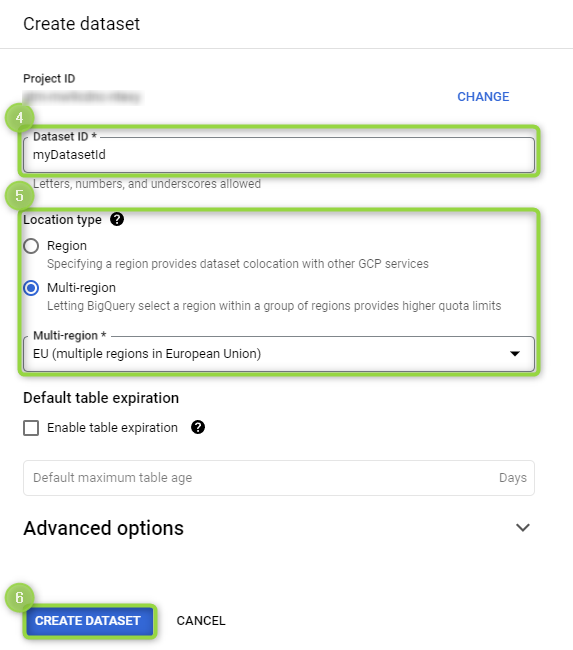 Input a `(4)` dataset identifier (E.g. "myDatasetId"), select a `(5)` location type and click `(6)` `CREATE DATASET`.