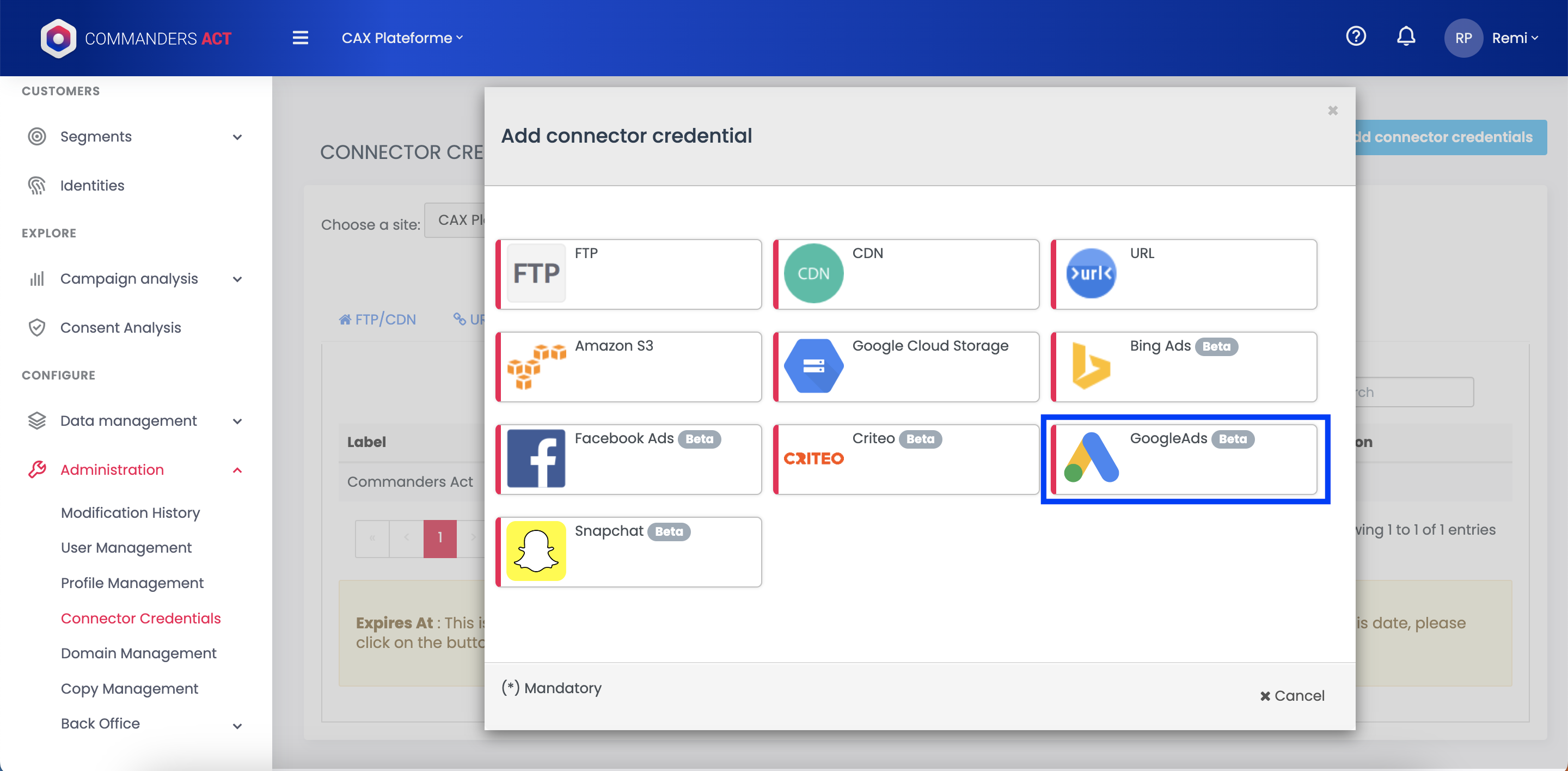 On the Connector Credentials page, click on '**Add connector credentials**' and select Google Ads.