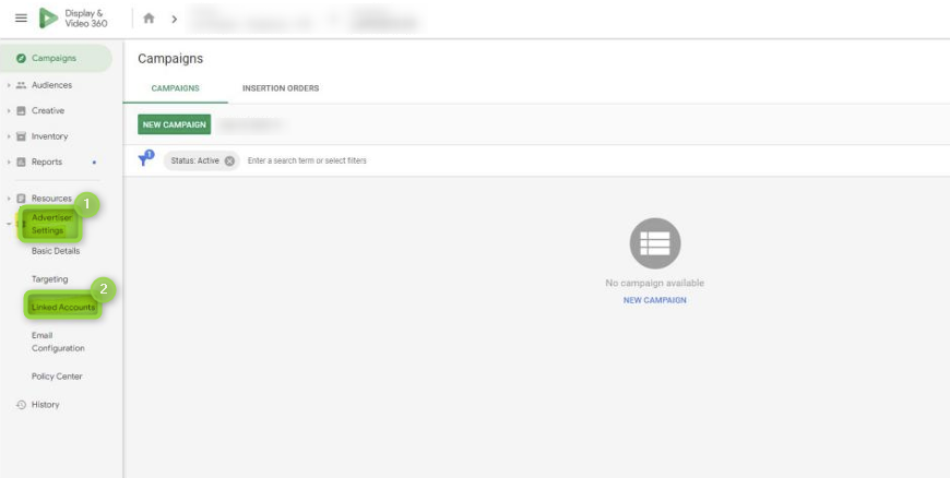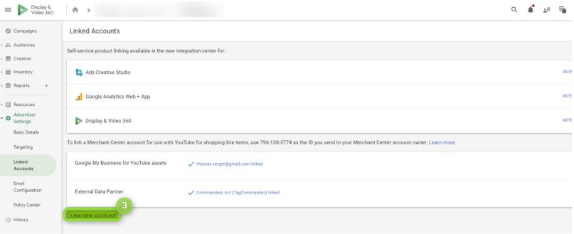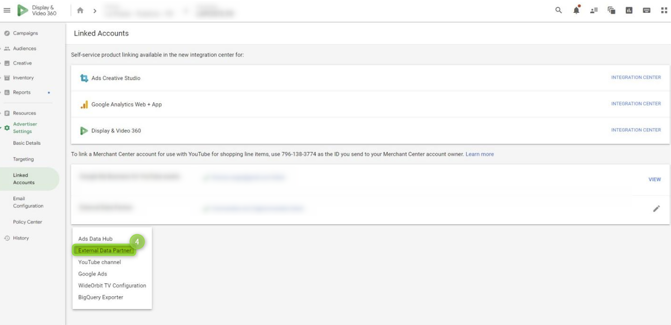Access your [Display & Video 360 account](https://www.google.com/ddm/bidmanager) and, from the left menu, open `(1)` `Advanced Settings` and select `(2)` `Linked Accounts` :