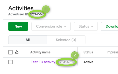 **\[1]** To find both values you can log into the CM360 account, and select the advertiser, then locate the <mark style="color:blue;">`Floodlight`</mark> tab in the left panel. Open <mark style="color:blue;">`Floodlight`</mark> ➜ <mark style="color:blue;">`Activities`</mark> and find/create the activity you are using to receive the EC data. Values being shown, highlighted in green below, are `(1)` <mark style="color:blue;">`Floodlight Configuration Id`</mark> `(2)` <mark style="color:blue;">`Floodlight Activity Id`</mark> :\\