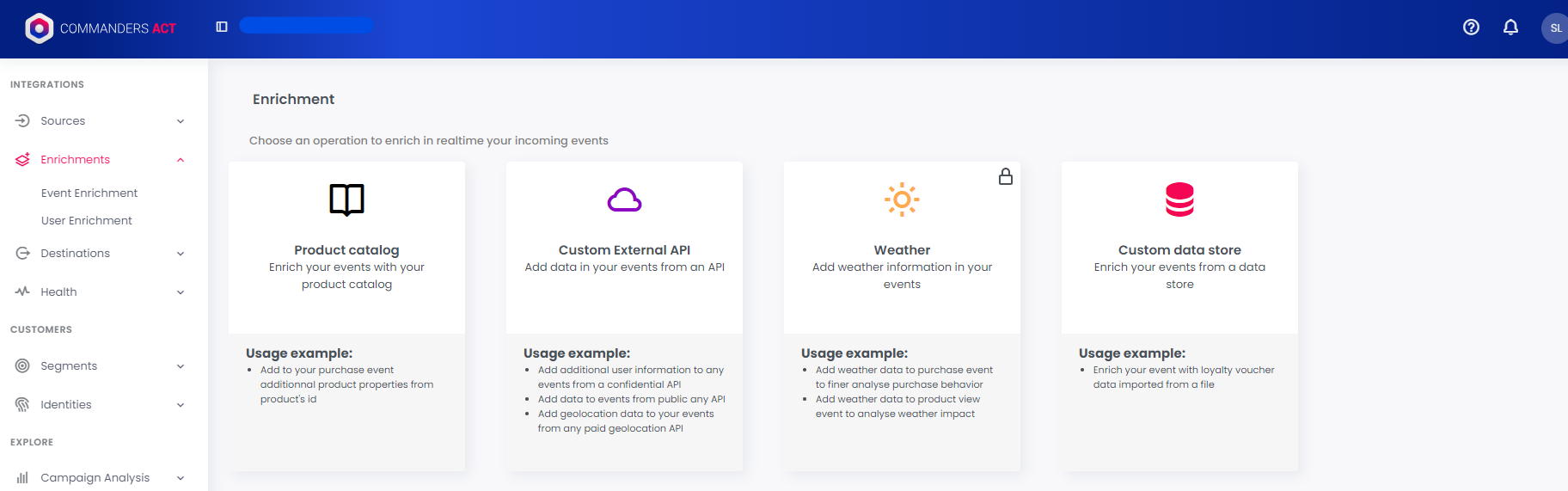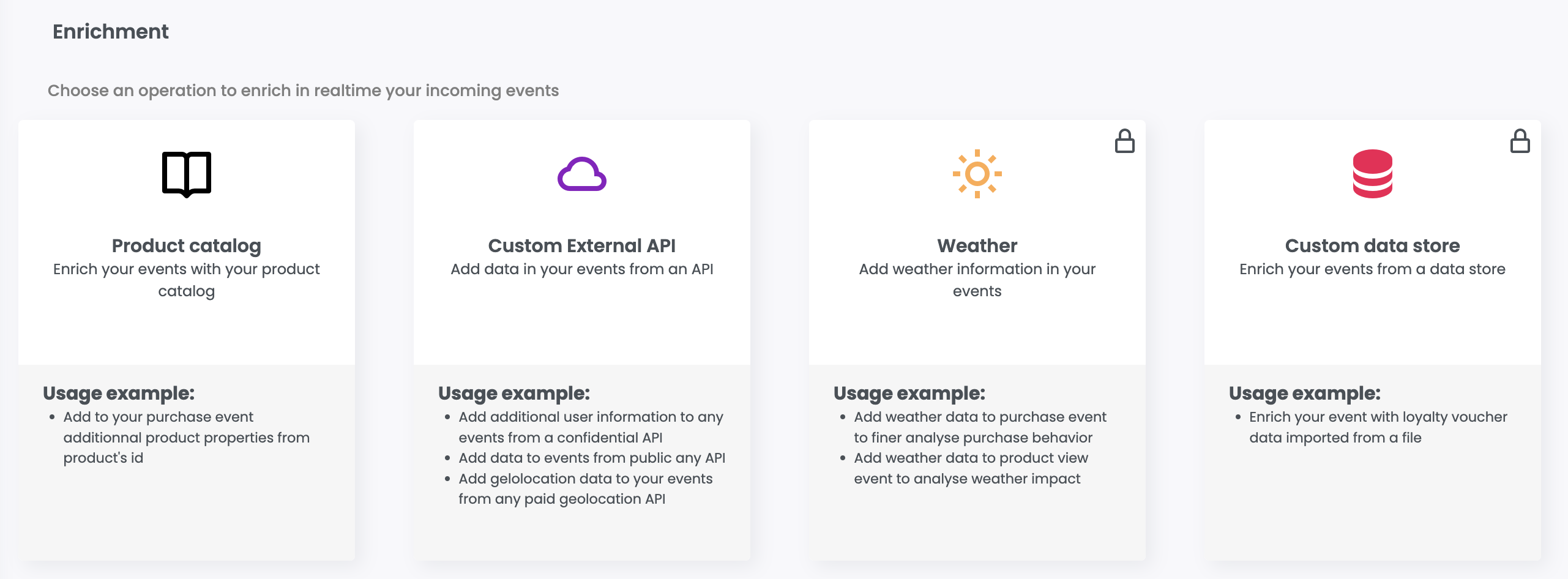 Enrichment could come from the Product catalog, a Custom external API, Weather database (coming soon) or any Custom data store.