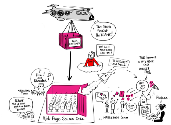 The browser-side **container** is a “box” containing all your partner solutions’ tags. Thus, tags that were formerly placed in your site’s source code are now all concentrated and managed in the same place – the container – for more **effective control** and **faster deployment**.