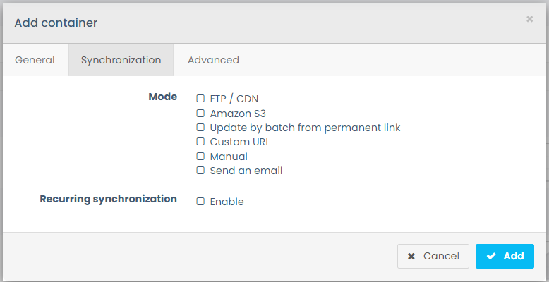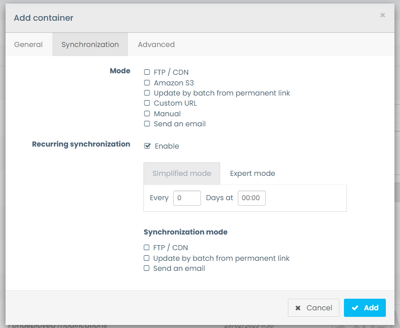 Recurring synchronization is used to automatically deploy a container on a regular basis via the deployment mode desired (FTP, batch or send by email).