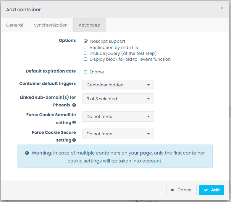 **NoScript support**: This option is used to create a noscript version of the container that allows both the container and its tags to execute for users without JavaScript activated on their browser.