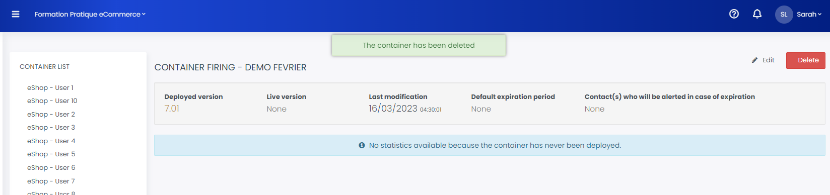 In the new window, you will see the containers’ list, the container you selected will be highlighted. To delete it click the red “Delete” button to the right.