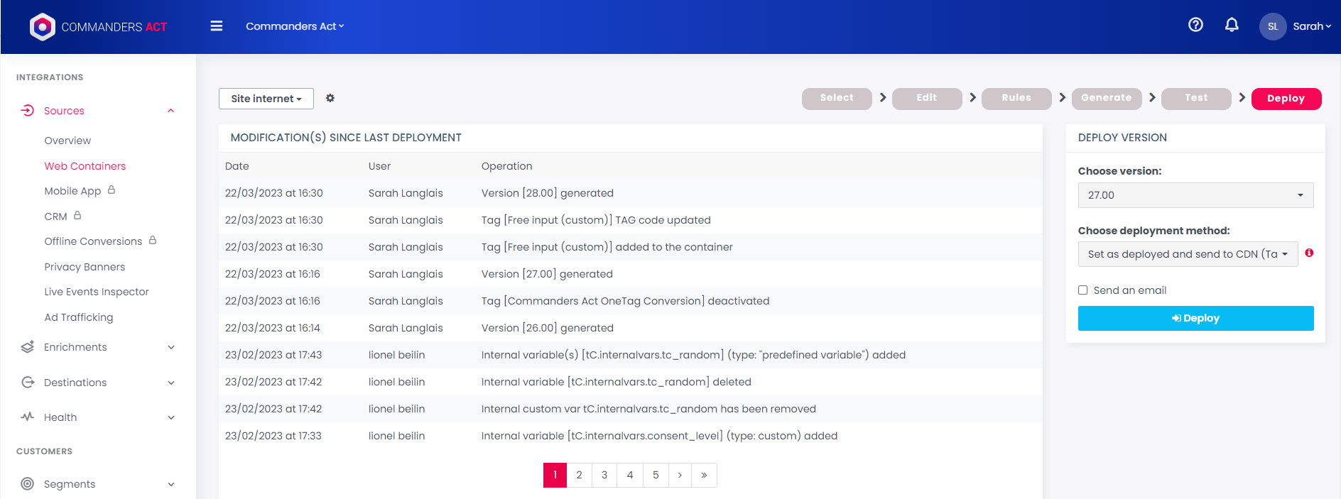 For each version generated, you will find his version number, creation date, status (“deployed” when it is the version currently deployed and/or “live” when it is the version currently called for the site) , the name of the person who generated the version, a comment, and the container’s size. You will also be able to load your selected container version directly from the interface or via a permanent link: