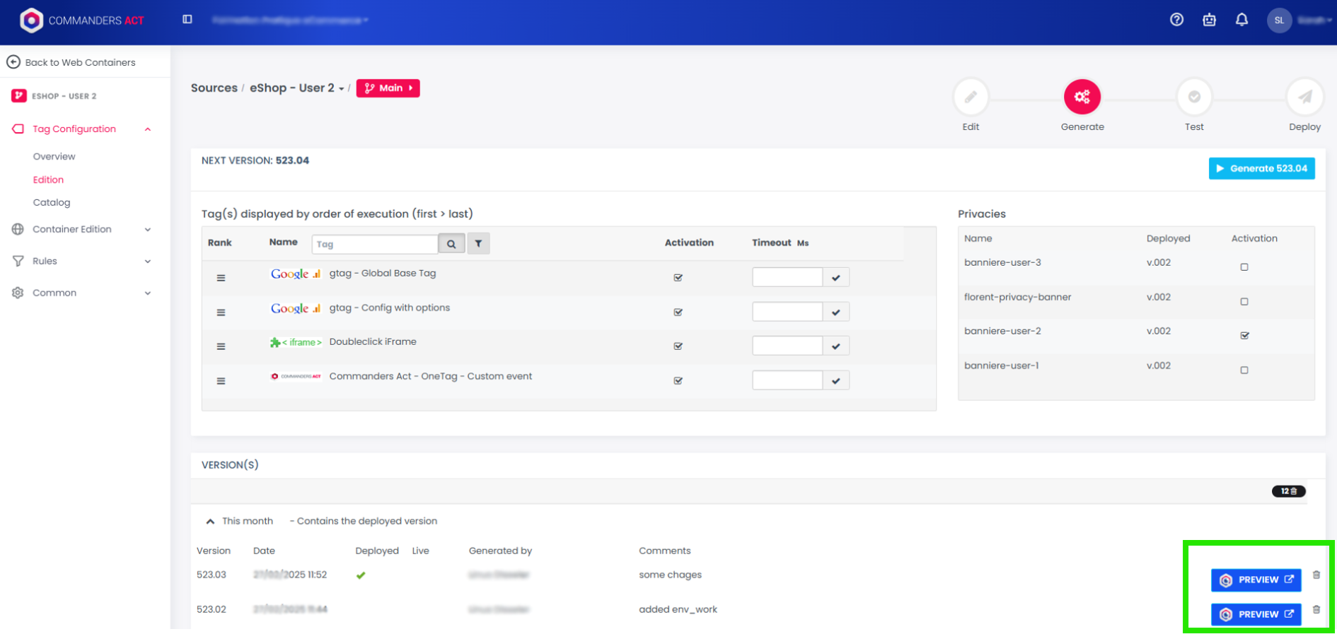 You can **test directly using the dedicated buttons** visible on the steps **"Generate," "Test," and "Deploy"** within the Commanders Act platform, making it easier to validate your configurations.