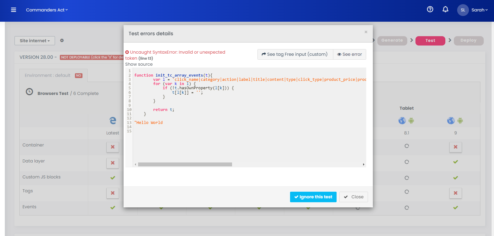 We recommend that you correct the errors detected in the Data layer, Custom JS Blocks, Tags, and Event before correcting the Container errors since the latter will most often disappear after the other four levels are corrected.