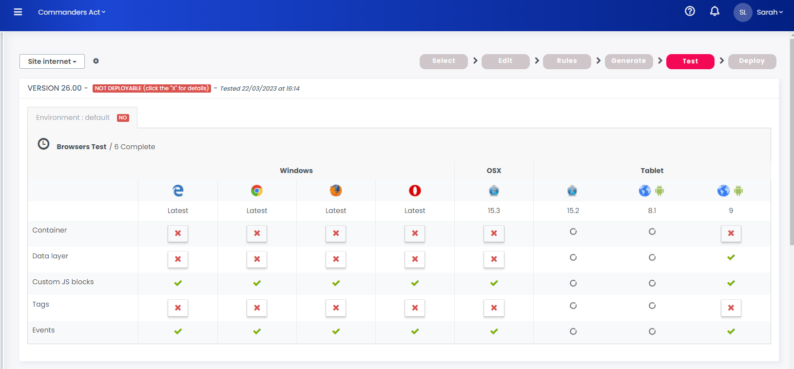 At first, it will block deployment of the faulty container, but you can ignore some of the errors found, such as those resulting from incompatible JavaScript elements with old versions of browsers (IE8 for example).