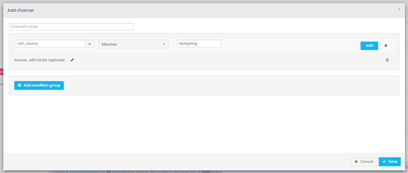 Name the channel and add the parameter that will store the value defining Retargeting (Add Condition)