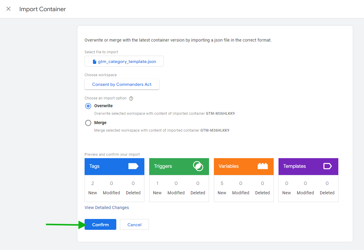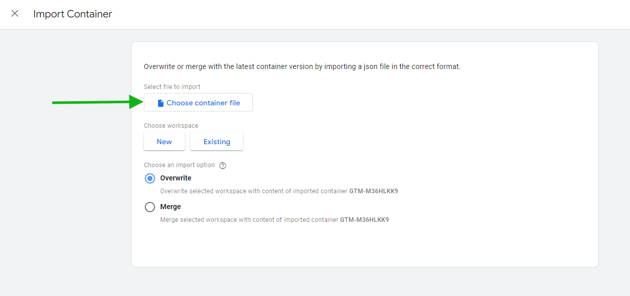 2. Dans ce nouveau compte de test, allez dans Admin, puis sur le côté droit de l'écran cliquez sur Import Container et sélectionnez la pièce jointe gtm\_category\_template.json