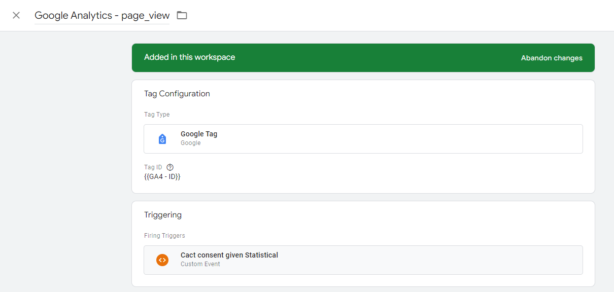 1. **"Google Analytics Page view"** n'est qu'un exemple de tag basique, le trigger "Cact consent given Statistical" est appliqué sur