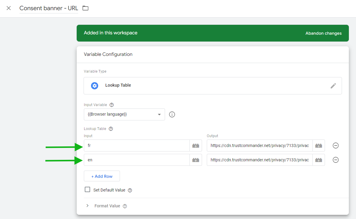 5. **"Consent banner - URL"**: à personnaliser avec l'URL de votre bannière de Consent.\