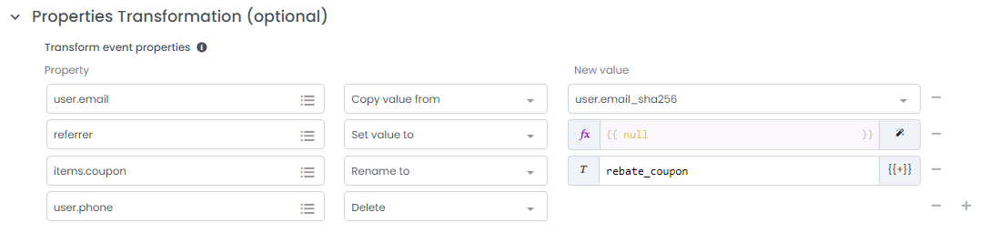 Utilisez des formules no-code pour transformer les propriétés. Vous pouvez utiliser plus de 25 formules (liste [ici](https://doc.commandersact.com/fr/fonctionnalites/data-quality/data-cleansing/supported-transformation-functions)).