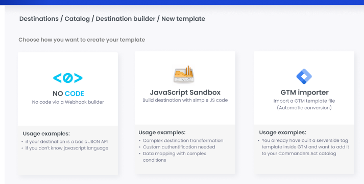 Le destination builder vous permet de créer votre propre destination personnalisée, soit avec une ***non**-code* approach (Webhook, FTP, API, GTM importer) or with a *javascript sandbox* aproach (***low**-code*) :
