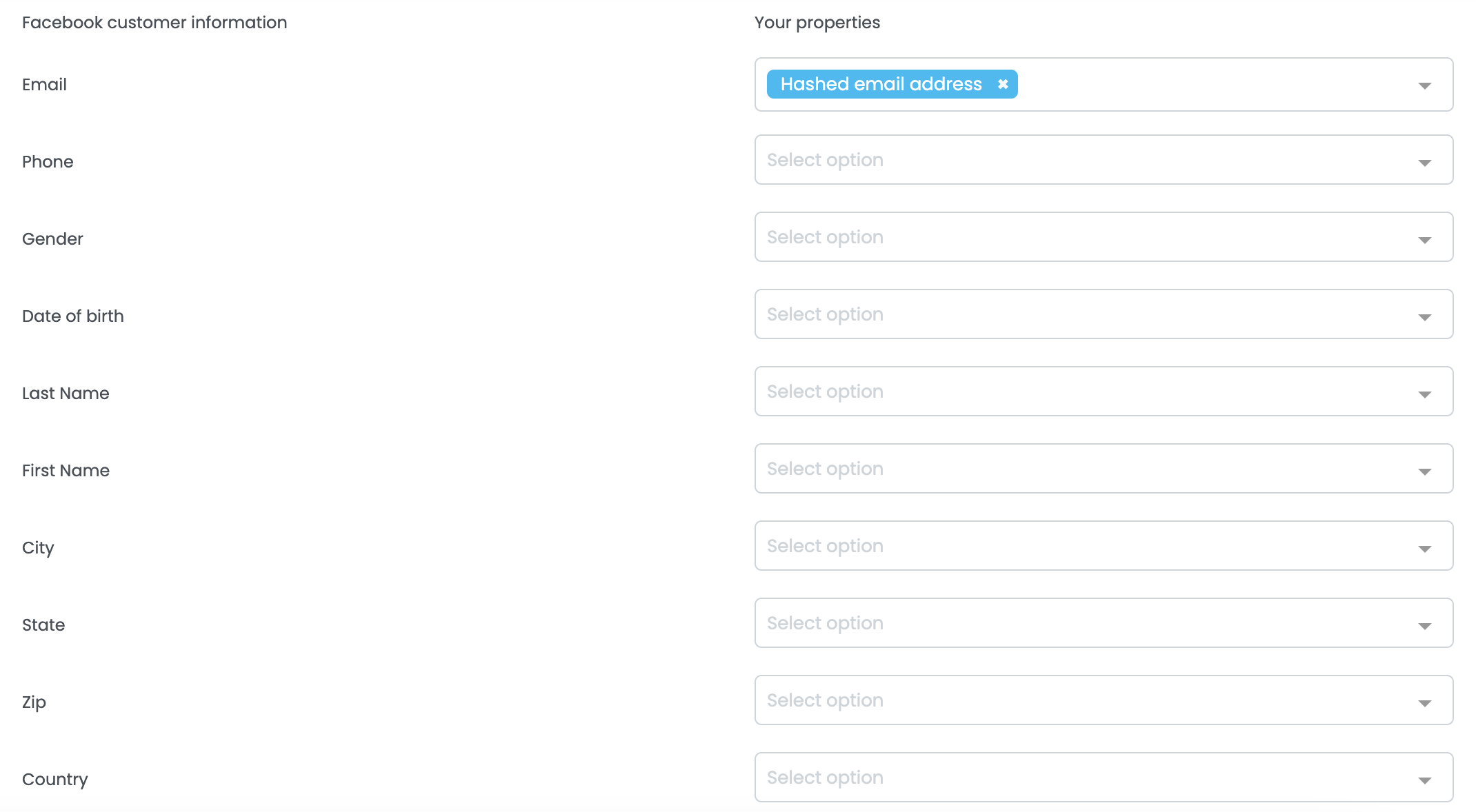 Plus vous envoyez d’informations à Facebook, meilleur est le matching avec Facebook. Vous pouvez choisir d’envoyer l’email, le numéro de téléphone ou toute autre information afin d’améliorer le matching avec Facebook.