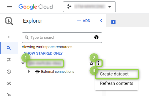 Accès [console BigQuery](https://console.cloud.google.com/) pour localiser votre `(1)` identifiant de projet et cliquez `(2)` le `trois points` à droite. Sélectionnez `(3)` `Créer un dataset` dans le menu ou, alternativement, vous pouvez utiliser un dataset existant et passer à la [sous-section suivante](#table).