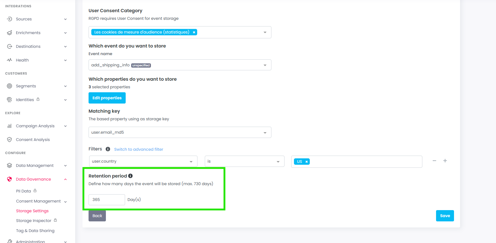 * **Définissez la période de conservation :** La durée de stockage est la période pendant laquelle les événements stockés sont conservés dans notre base de données (maximum 730 jours autorisés).