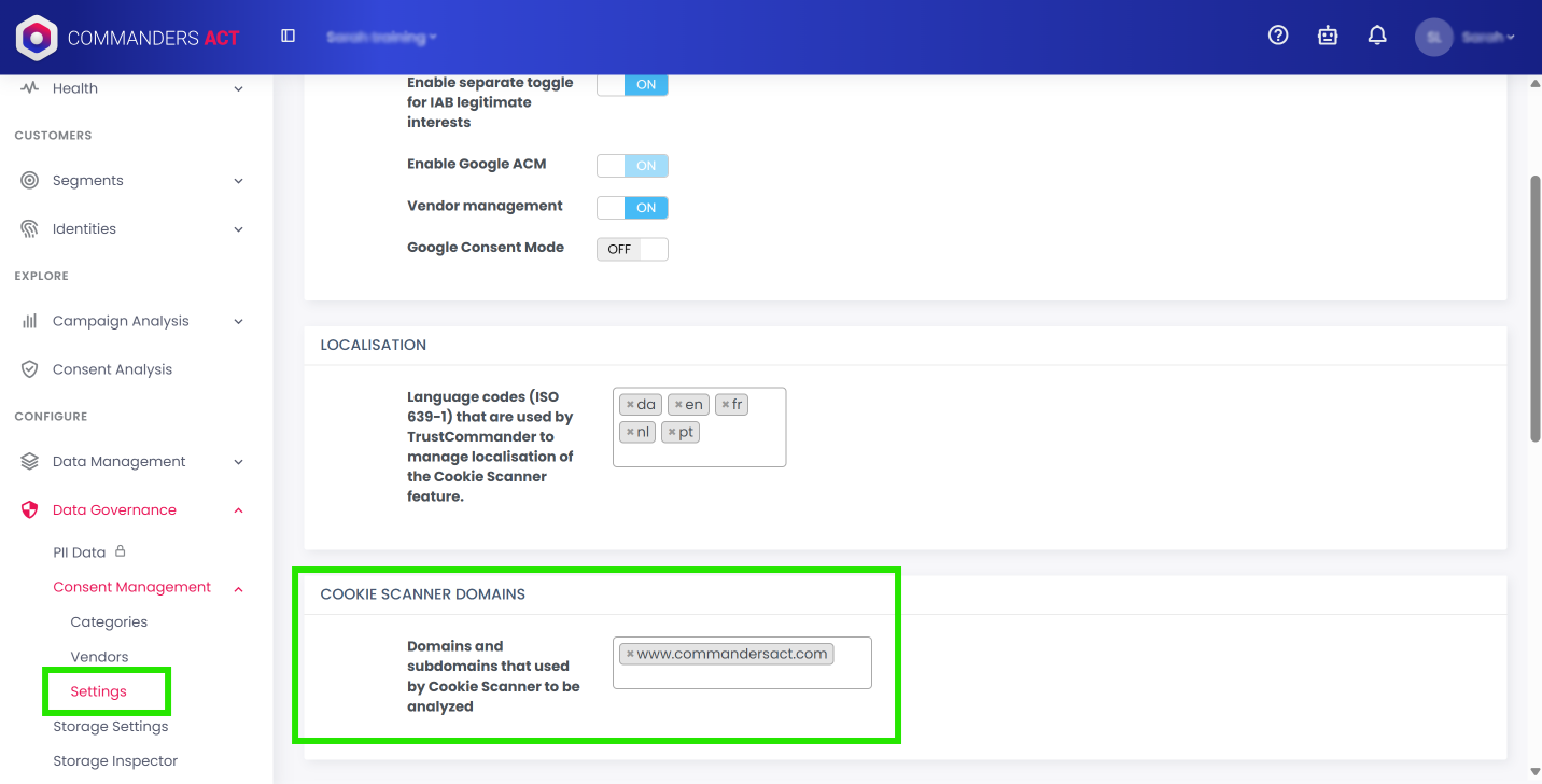 2-Déclarez les domaines que vous devez faire scanner avec le Cookie Scanner `Data Governance > Consent Management > Settings > Cookie Scanner Domains`