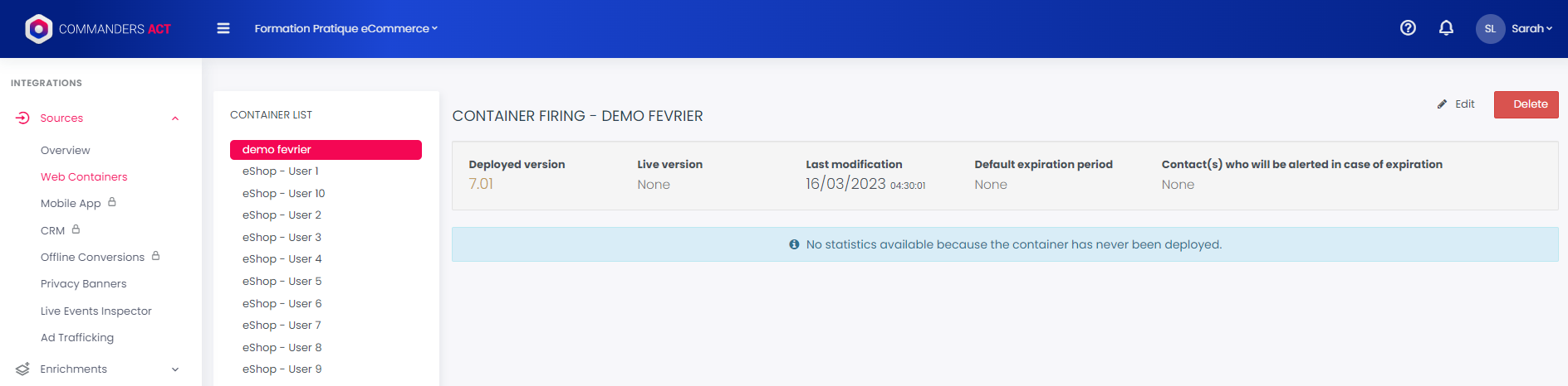 Dans la nouvelle fenêtre, vous verrez la liste des containers, le container que vous avez sélectionné sera mis en évidence. Pour le supprimer, cliquez sur le bouton rouge « Delete » à droite.