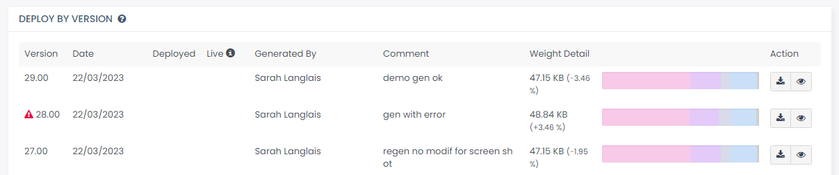 Consulter l’historique des versions générées dans la «DÉPLOYER PAR VERSION» section.